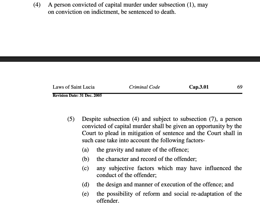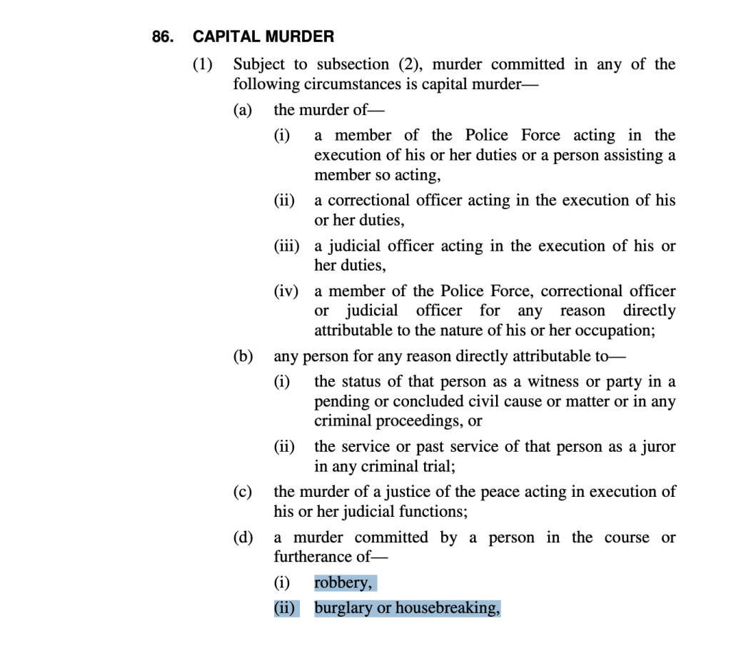 Under section 86(1)(d)(ii) of the Saint Lucia Criminal Code, murder committed in the course of burglary or housebreaking constitutes capital murder.